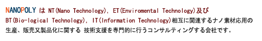 Nanosilver(商品名 NANOMIX™)を始めほかの金属のナノ粒子(Pt, Au, Cu, Ge, Ca, Mn, Znなど) を活用してプラスチック、繊維、医薬品、化粧品、食品及び産業用、農業用、畜産用、水産用製品そして生活用品にいたるまでの広い分野にNano技術を発展してまいりたく思います。