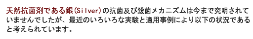 1. 銀(Silver))のデルタプラスイオン(Agδ+)1) による抗菌及び殺菌作用: 細菌の-SH基、-COOH基、-OH基などと結合して細 菌の細胞核膜を破壊、細胞の機能を停止させると思われます |